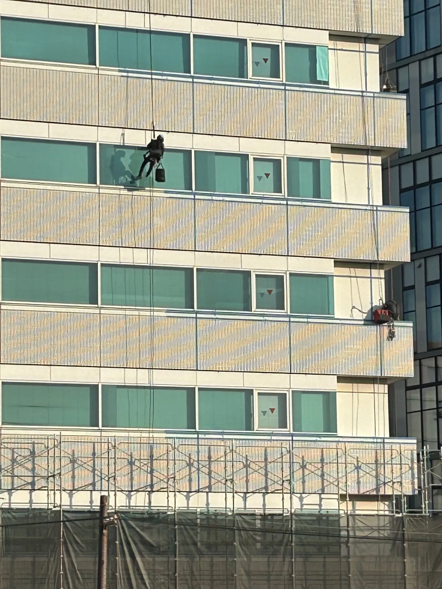 こんにちは!本日は新大阪駅に用事がありまして、立ち寄ったカフェの窓から見えたコーキング作業を写真におさめました、ブランコと言われる降下のみの機能を持った現場資材を使っての作業をなされていました、慣れるまではすごく恐怖があると思いますが、今作業なされてる方は慣れているのが一目でわかりました、私はまだ一度も経験はないですが、チェアーと言う1人乗りの椅子みたいになってるのでは作業経験はございます、何度も乗った事は無いですがチェアーは上昇も降下も致します。皆さんご安全に‼︎